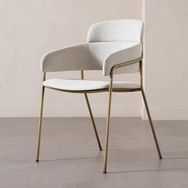 Mudo Concept sandalye modelleri ile dekorasyonunuzda modern detaylar.Gold metal iskeletinin yanı sıra kolçaklı tasarımıyla konforu sunan metal sandalye, modern tasarımını keten görünümlü kumaşıyla güçlendiriyor.