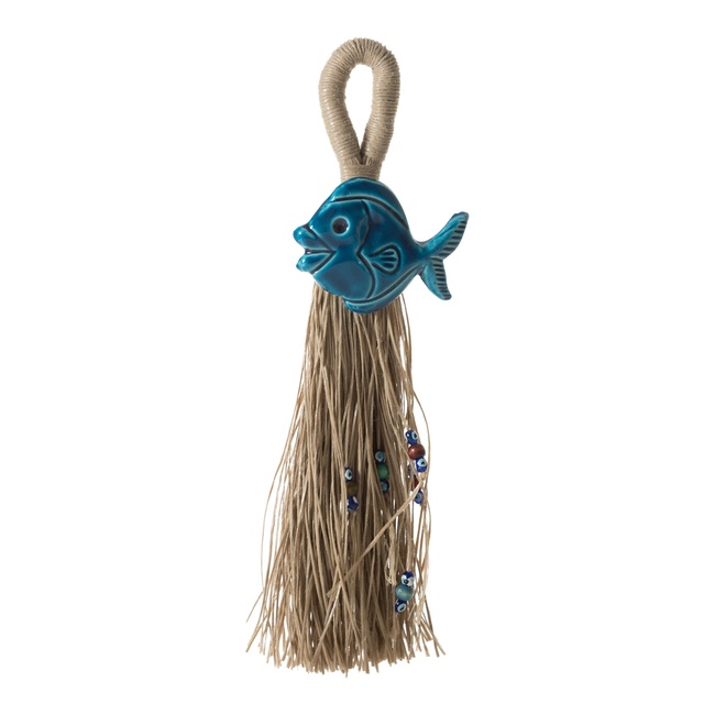 Pürüzsüz yüzeyli balık figürü, rustik görünümlü halat askısı ve püskül detayıyla estetik bir bütünlük oluşturur. Nazar boncuğu süslemeleri, ürüne dekoratif bir ritim ve karakter katar. Antre, salon, kapı girişi, balkon veya yazlık ev gibi farklı alanlarda kullanılabilen Ocean Nazarlık, bulunduğu mekana özgün bir dokunuş sağlar.
