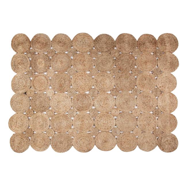 Jüt örgüsüyle dikkat çeken bu halı, yuvarlak motifleri ve bej ile kahverenginin doğal tonlarıyla rustik bir estetik sunar. Hasır dokulu yüzeyi, bohem veya rustik tarzda dekore edilmiş salon, oturma odası ya da yatak odaları için tamamlayıcı bir parça olarak öne çıkar. Kenarlarındaki yuvarlak detaylar ise tasarımına özgün bir karakter kazandırır.