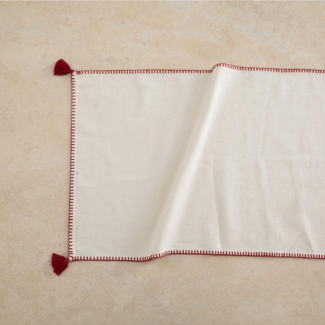 Mat ve hafif kırışık dokusu, ürünün doğal karakterini ön plana çıkarır. Krem ve beyaz tonlarındaki zemin rengi, farklı dekorasyon stilleriyle kolayca uyum sağlar ve ferah bir görünüm sunar. Bordo renkli püskül detayları ve uyumlu dikişler, ürüne sofistike bir kontrast ve hareketlilik kazandırır. Bu masa runner modelini yemek masasında, konsolda veya orta sehpa üzerinde kullanarak dekorasyonunuza sıcak ve stil sahibi bir dokunuş ekleyebilirsiniz.