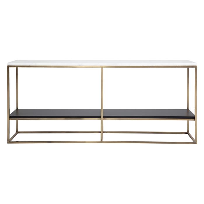 Üst tablasında kullanılan doğal mermerin kendine has dokularına sahip renk geçişleri, alt tablası ise siyah lakeden oluşan, gold metal ayaklara sahip dresuar, iki adet tablasıyla fonksiyonel tasarımıyla öne çıkıyor.