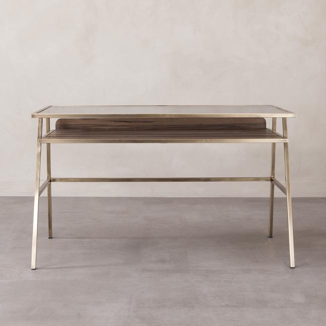 Çalışma masası modelleri arasında eşsiz tasarıma sahip Punto Çalışma Masası, Chic tarzın güçlü yorumuyla buluşuyor. Yüzeyinde diğer cam türlerine oranla 4-5 kat daha dayanıklı olan temperli cam kullanılan, eskitme gold metal ayaklarıyla şık tasarıma sahip çalışma masası, cam tablasının altında yer alan ceviz kaplama ahşap tablasıyla fonksiyonel bir kullanım da sunuyor. Siz de çalışma alanlarınızda dekorasyon zevkinizden ödün vermeden zamansız ve muadili olmayan raflı çalışma masasına sahip olabilirsiniz.