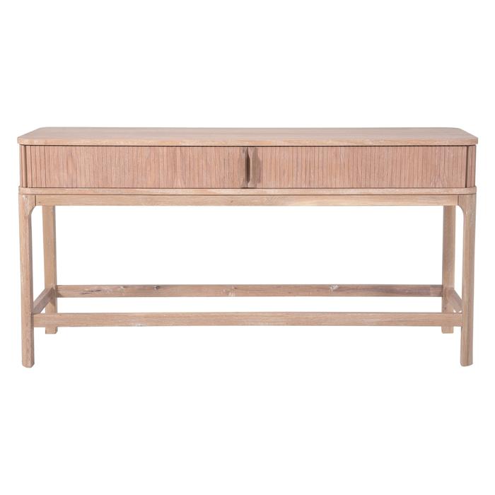 İki adet sürgülü kapaklarıyla kullanım kolaylığı sağlayan, incelikli el işçiliği ile beyaz patine işlemi uygulanan ahşap dresuar, bulunduğu mekana sade bir doğallık katıyor.