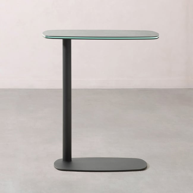 İnce profili ve tek ayaklı tasarımı, mekana ferah ve hafif bir görünüm kazandırırken, yuvarlatılmış köşeleriyle yumuşak bir estetik sunar. Pürüzsüz yüzeyi ve cam görünümlü üst tablasının kenarındaki açık yeşil detay, sehpanın modern karakterine canlılık katar. Koltuk yanı, yatak başucu veya antre gibi farklı alanlarda pratik bir tamamlayıcı olarak kullanılabilir. Minimalist formu sayesinde küçük alanlarda da şık ve fonksiyonel bir kullanım imkanı sağlar. Üzerine bir kitap, bir fincan kahve veya dekoratif objeler yerleştirmek için ideal bir yüzey sunar.