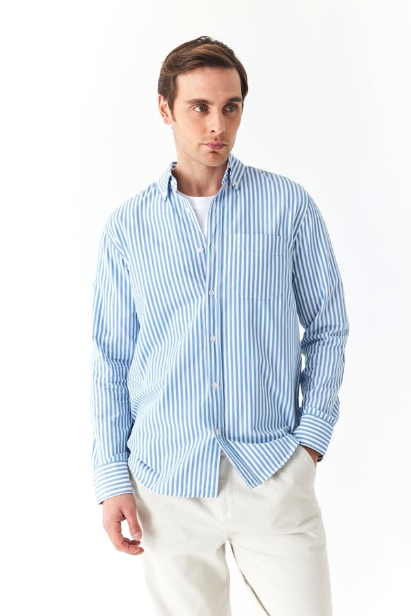 Stiline farklı bir dokunuş katmak isteyenlerin favorisi olacak regulat fit çizgili uzun kollu gömlek ile tanışın. %100 pamuk kumaştan üretilen gömlek gün boyu konfor ve şıklığı bir arada sunuyor. Zamansız dikey çizgili görünümü sayesinde tarzınıza hareket katacak olan gömlek, her mevsim kombinlerinizin vazgeçilmezi halina gelecek. Krem rengi pantolonlar ile kombinleyerek enerjik bir görünüm sağlayabilir ya da kumaş pantolonlarla klasik bir tarz elde edebilirsin.