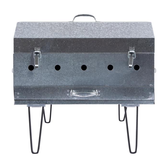 Retro görünümlü kapaklı galvaniz mangal, özel tasarımı ile çanta şeklinde kolayca taşınabilir ve ayakları katlanarak kullanılabilir.
