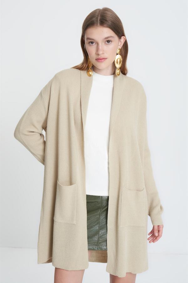 Cepli fitlli midi hırka hem şık hem de günlük kombinlerinde kurtarıcı parçalar arasında yer alacak. Şal yaka cep detaylı midi triko hırka ile eteklerini kombinleyerek feminen tavrını spor bir yorumla tamamlayabilirsin.