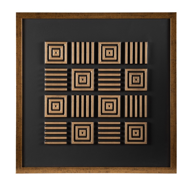 Siyah fon üzerinde öne çıkan kabartmalı geometrik desenler, üç boyutlu bir etki yaratarak tasarıma derinlik kazandırır. Altın sarısı çerçevesi ve desenlerdeki metalik dokunuşlar, ışıkla etkileşime girerek tabloya sofistike bir parlaklık ekler. Kare formu sayesinde salon, yatak odası veya ofis gibi farklı alanlarda tek başına odak noktası olarak kullanılabilir. Nötr ve güçlü renk paleti, farklı dekorasyon stilleriyle kolayca uyum sağlar.