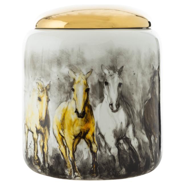 Sanatsal estetiği ve modern tasarımı buluşturan Selena porselen küp, yaşam alanlarınıza zarif bir dokunuş sunar. Üzerindeki at deseni, hareketin ve özgürlüğün estetik bir yansıması olarak öne çıkarken, pürüzsüz ve parlak porselen yüzeyiyle dikkat çekici bir obje haline gelir. Altın rengi kapak detayı ise ürüne şık bir kontrast ve lüks bir görünüm kazandırır.