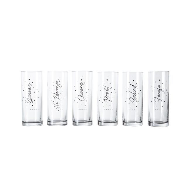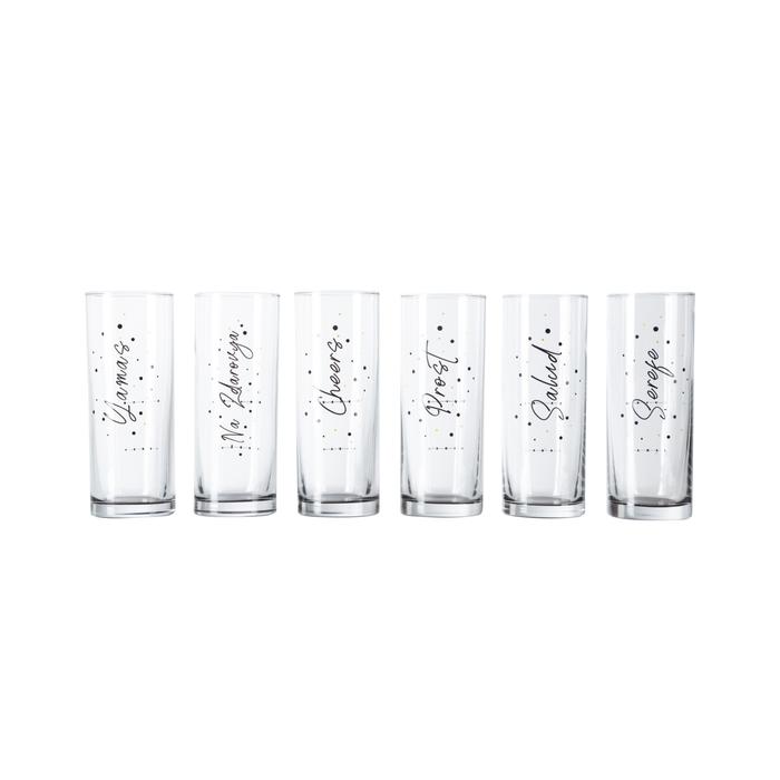 Eğlenceli desenli 6 farklı dilde 'Şerefe' yazılı 6'lı rakı bardağı seti ile masalarınıza keyifli dokunuşlar yapın. Bardakların yazıları siyah renktedir ve gold noktalarla hareket katmaktadır, hacimleri 200ml'dir.