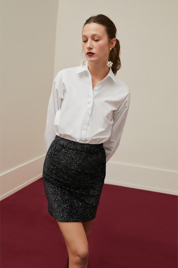 Mudo etek modelleri ile özgün parçaları keşfet! Drape detaylı simli tasarımıyla gece şıklığına modern bir yorum katacak simli mini eteği, gömlekler, crop bluzlar ile kombinleyebilirsin.