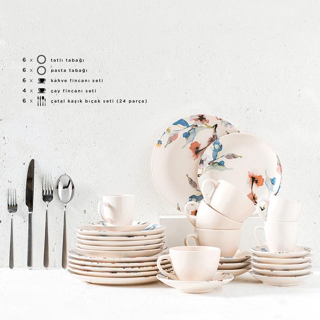 56 parça set: 6 Adet Tatlı Tabağı , 6 Adet Pasta Tabağı , 6 Adet Kahve Fincanı , 4 Adet Çay Fincanı , 24 Parça Çatal Kaşık Bıçak Seti ( 6 Adet Yemek Kaşığı , 6 Adet Çatal , 6 Adet Bıçak , 6 Adet Tatlı Çatalı)