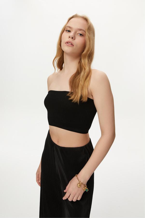 Straplez crop top, genç ve dinamik görünümünü modern çizgileriyle güçlendirecek. Altın zincirler veya boncuklu kolyeler ile stiline hareket katarak basic şıklığını güçlendirebilirsin.