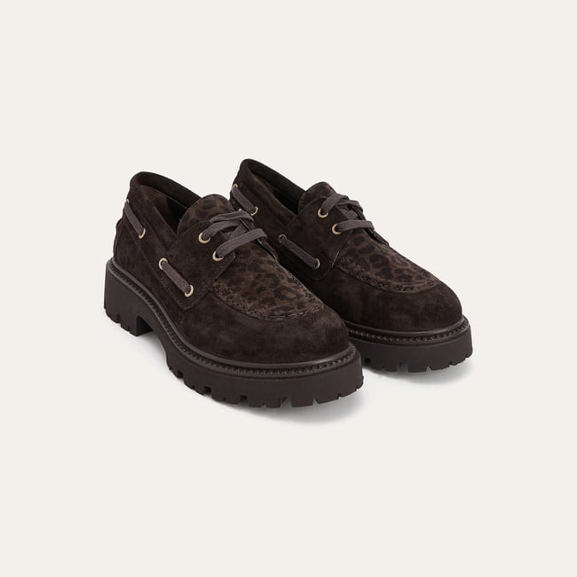 Ayakkabının süet dokulu yüzeyi, dikkat çekici hayvan deseniyle birleşerek tasarıma dinamik bir karakter kazandırır. Klasik loafer silüetini güncel trendlerle buluşturan kalın platform tabanı, gün boyu konfor sunarken modern bir görünüm sağlar. Ön kısmında yer alan dekoratif metal toka detayı ise tasarımı tamamlayan bir unsurdur.