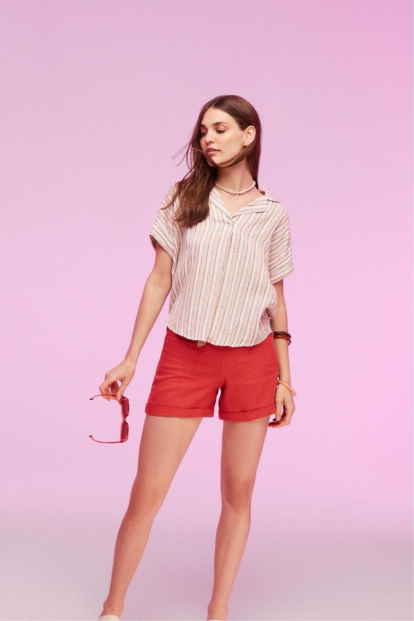 Mudo denince akla elen keten, yeni nesil bir yorumla kısa şort modellerinde buluştu. Doğal dokusu, güneş ışınlarına karşı dayanıklı yapısı, iri gözenekleriyle ferah hissettiren keten, yaz aylarında vazgeçilmezin olacak. Tahta düğmeleriyle öne çıkan yüksek bel mini keten şortu kısa croplarla tercih edebilir, gömleklerle şık bir görünüm yakalayabilirsin. Hasır çantalarla ve espadrillerle güçlendireceğin stilinde yazın enerjisini kombinlerine dahil edebilirsin.