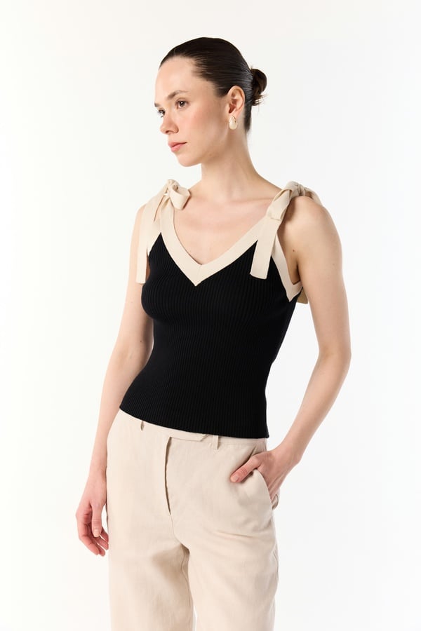 V YAKA BAĞLAMA DETAYLI KOLSUZ TRİKO KAZAK