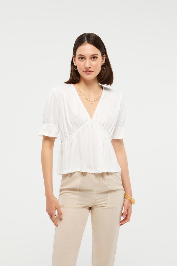 Bluz modelleri ile bussines casual şıklığı Mudo'da. V yaka, belden bollaşan kesimiyle öne çıkan beyaz bluz, balon kollarıyla retro esintilerini tasarımında barındırıyor. Chino pantolon, skinny pantolonlarla kombinleyebileceğin bluzu, basic ceketlerle tamamlayabilirsin.