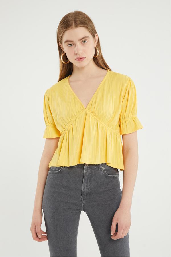 Bluz modelleri ile bussines casual şıklığı Mudo'da. V yaka, belden bollaşan kesimiyle öne çıkan beyaz bluz, balon kollarıyla retro esintilerini tasarımında barındırıyor. Chino pantolon, skinny pantolonlarla kombinleyebileceğin bluzu, basic ceketlerle tamamlayabilirsin.