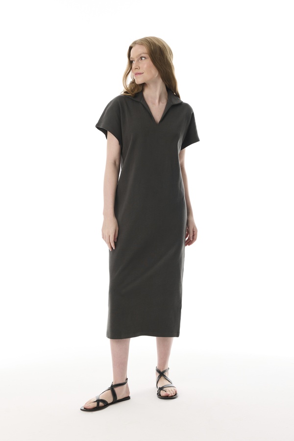V YAKA KISA KOLLU MİDİ ELBİSE