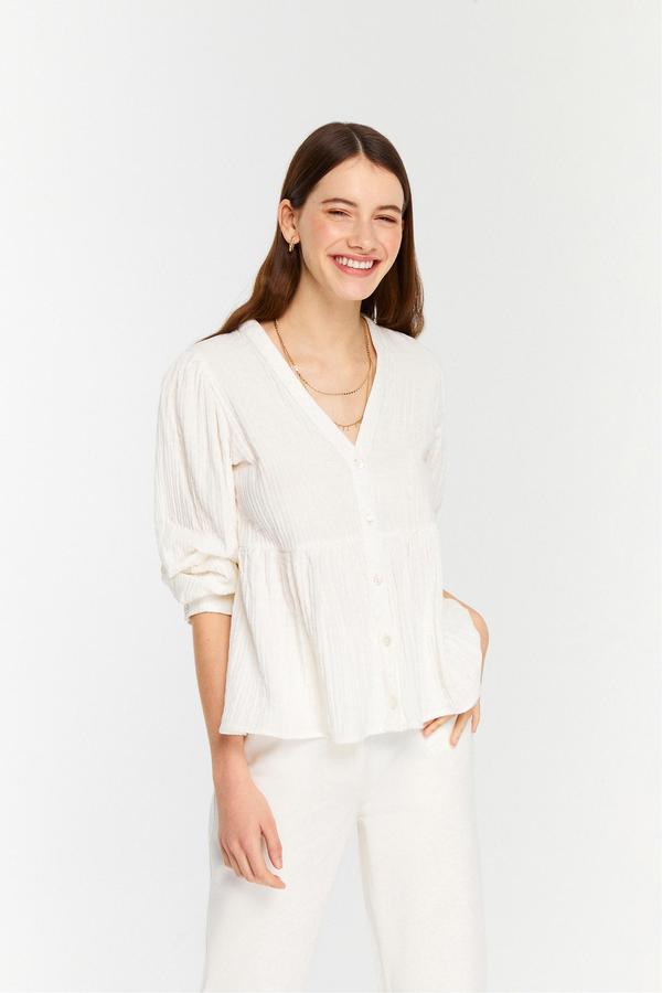 Kendinden dokulu kumaşıyla sade tasarıma hareket katan v yaka, düğmeli uzun kollu bluz, ofis ve günlük kombinlerinde seninle birlikte olacak. Beyaz pantolon, jean pantolon modelleri ile kullanabileceğin uzun kollu bluzu, gold aksesuarlarla birlikte tamamlayarak güçlü bir yorum katabilirsin.