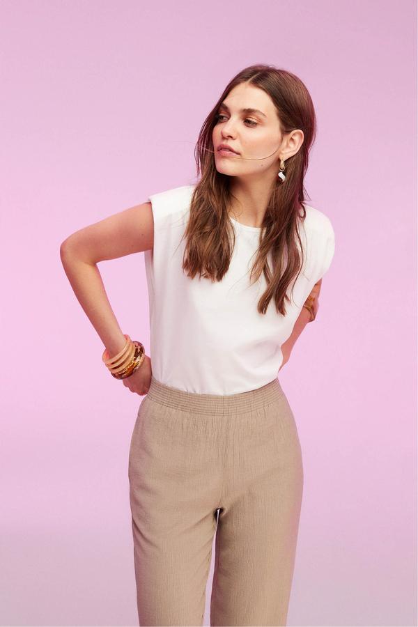 80'lerin zarif ve iddialı dokunuşları Mudo kalitesiyle buluşuyor. Pamuklu kumaşıyla rahat hissedeceğiniz, kolsuz vatkalı tişört hem ofis hem de günlük şıklıkta kurtarıcın olacak. Relax kesim pantolon, cullote pantolon, havuç kesim pantolon ile birlikte kombinleyerek ofis şıklığını yaratabileceğin tişört ile şort ve eteklerinle de çabasız ve şık bir görünüm elde edebilirsin.