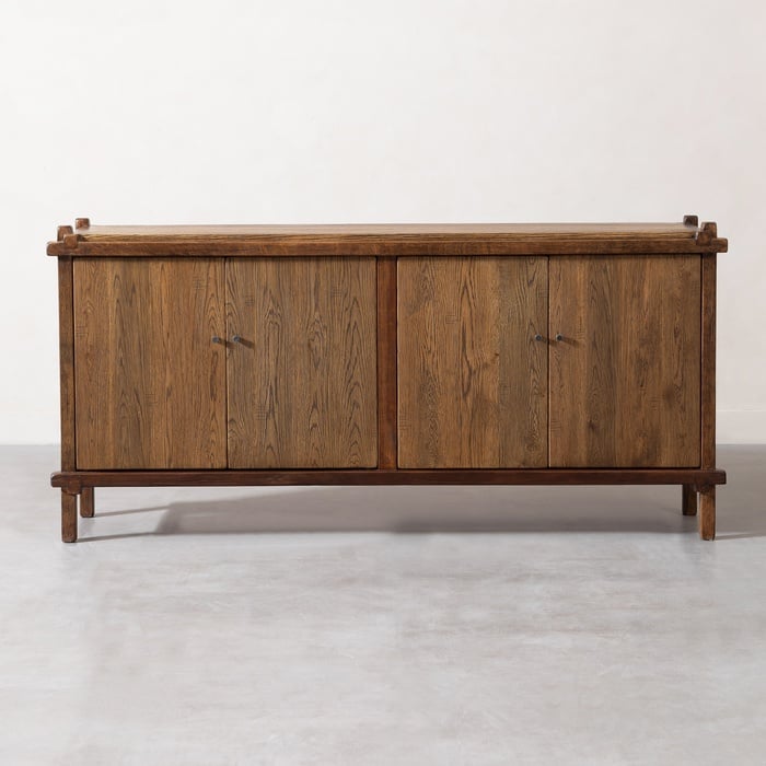 Dört kapaklı geniş iç hacmiyle düzenli bir saklama alanı sunan konsol, minimalist metal kulplarıyla zarif bir detay kazanır. Yüzeyindeki dikey damarlar ve köşelerdeki belirgin detaylar, ürünün doğal karakterini ön plana çıkarır. Yerden yüksek ayakları sayesinde hem ferah bir görünüm sunar hem de temizlik kolaylığı sağlar. Mat ve dokulu yüzeyi, İskandinav veya rustik dekorasyon stillerini benimseyen mekanlar için tamamlayıcı bir seçenek oluşturur.