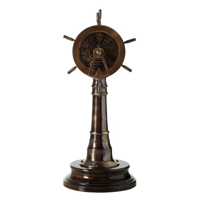 Wheel Biblo, denizcilik temasını yaşam alanlarınıza taşıyan dekoratif bir objedir. Gemi dümeni şeklindeki tasarımı ve bronz renk tonu ile nostaljik bir atmosfer sunar. Üzerinde yer alan "Stop, Slow, Half, Full" gibi klasik denizcilik terimleri, ürüne özgün bir detay kazandırır. Ahşap tabanı sayesinde dengeli bir şekilde sergilenebilir ve masa, kütüphane rafı veya konsol gibi alanlarda dekoratif bir odak noktası oluşturur.