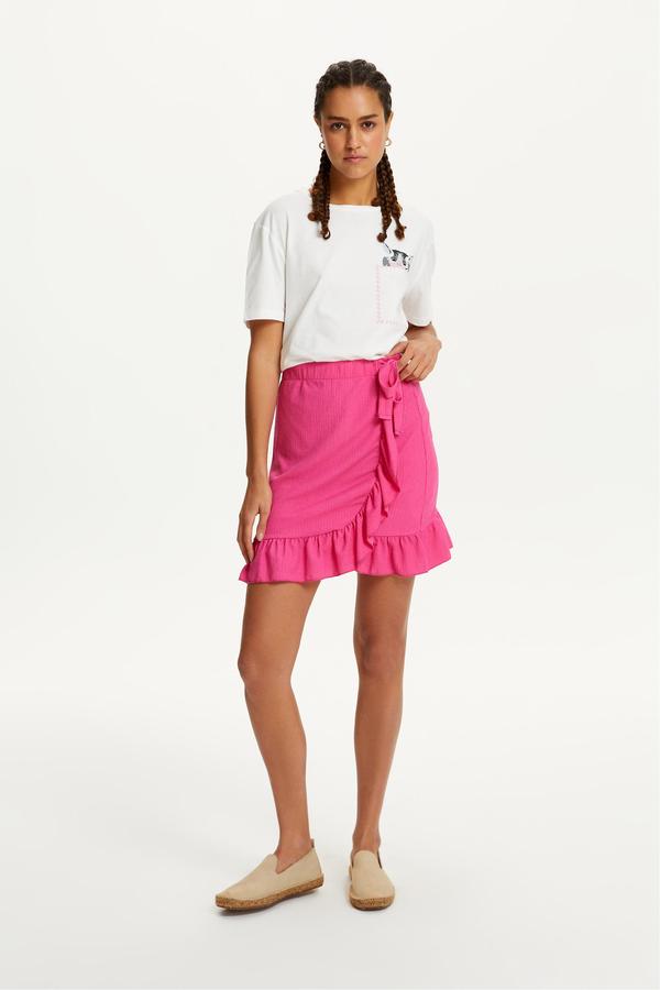 Fırfırlı mini etek kendine has dokusuyla dikkat çekiyor. Yandan bağlama detaylı mini etek, pembenin göz alıcı tonuyla stiline renk katacak. Basic bluzlar ile kombinleyebileceğin mini etek Mudo'da.