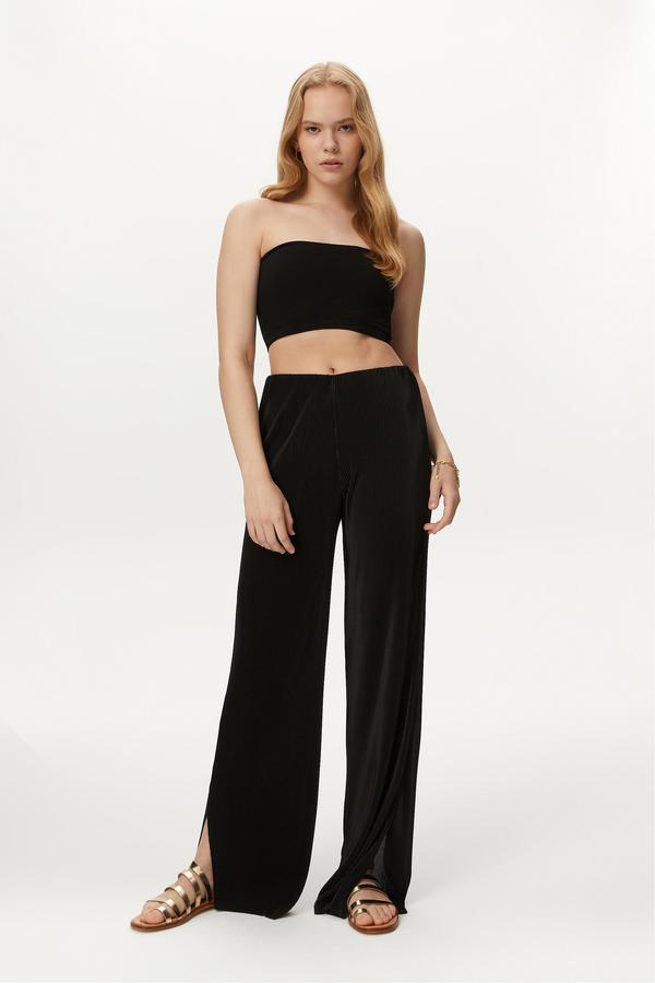 Mudo kadın siyah pileli pantolon modelleriyle zarif şıklığı keşfet. Eşsiz dokulu pileli kumaşıyla öne çıkan, yırtmaç detayı bulunan rahat kesim siyah pantolonu crop toplar ile kombinleyebilir, bodysuitler ile şık tavrını tamamlayabilirsin.